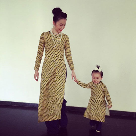 Cùng mặc áo dài, Linh Nga còn làm điệu cho con gái bằng chuỗi hạt trai giống mình.