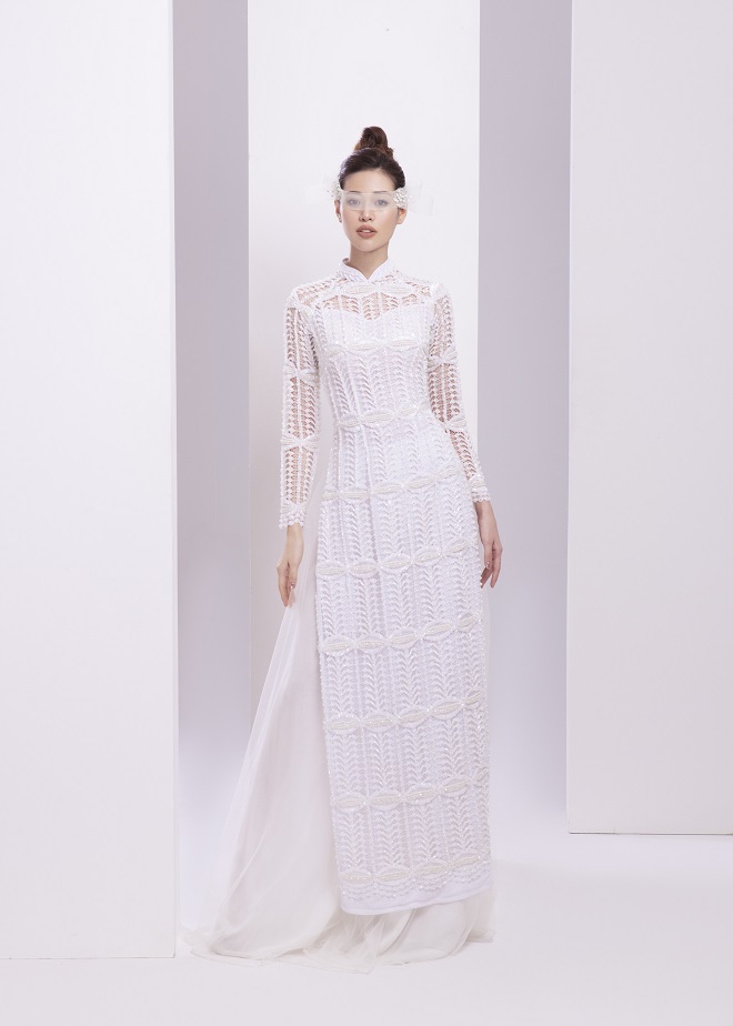 Trong đó, đáng chú ý là họa tiết nổi được sắp xếp một cách tinh tế, giúp người mặc trở nên nổi bật hơn khi di chuyển. Nhà thiết kế Minh Châu cho biết việc thuyết phục những cô gái trẻ diện áo dài khi xuất hiện trong những dịp quan trọng khá khó khăn.