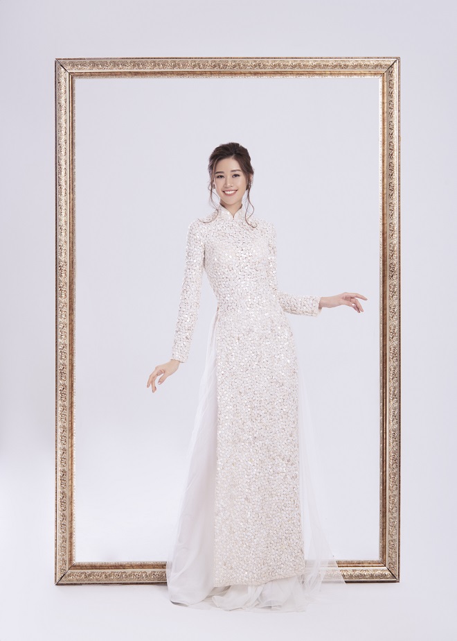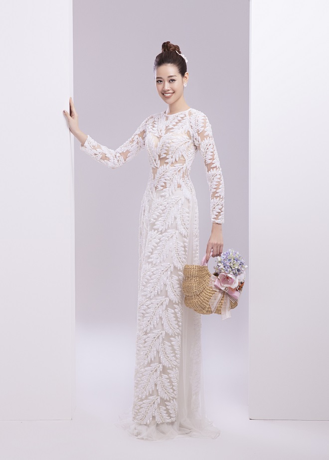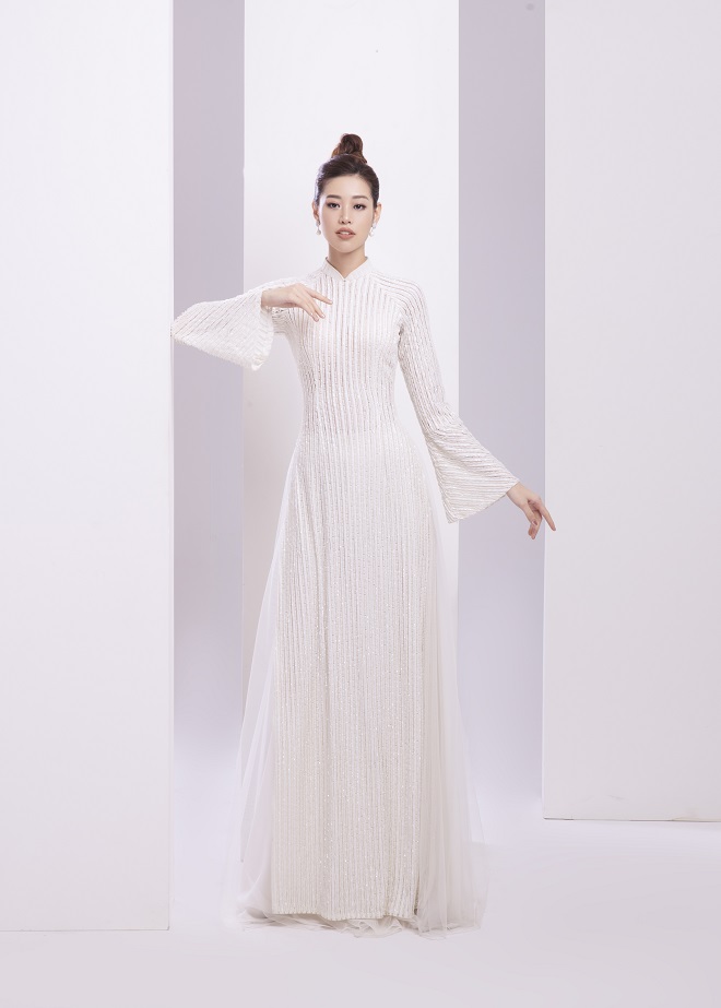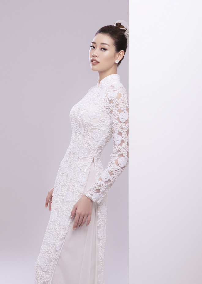 Trong loạt thiết kế áo dài mà Khánh Vân diện, đáng chú ý là họa tiết hoa được thêu nổi trên nền vải ren mỏng. Cùng với việc nắm bắt số đo qua những lần hợp tác trước đó, nhà thiết kế tạo ra những bộ trang phục vừa tôn lên đường nét quyến rũ cho người mặc nhưng lại rất kín đáo và hiện đại.