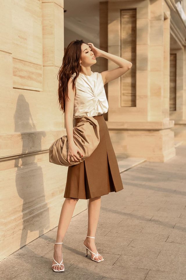 Khánh Vân mix nền nã thiết kế túi cầm tay này cùng bộ trang phục đậm vintage, nữ tính của mình