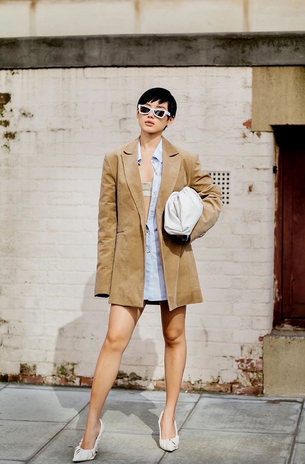 Á hậu Hà Thu trong bộ cánh thanh lịch với suit màu xám bạc xẻ ngực mix cùng phụ kiện túi Pouch Bag