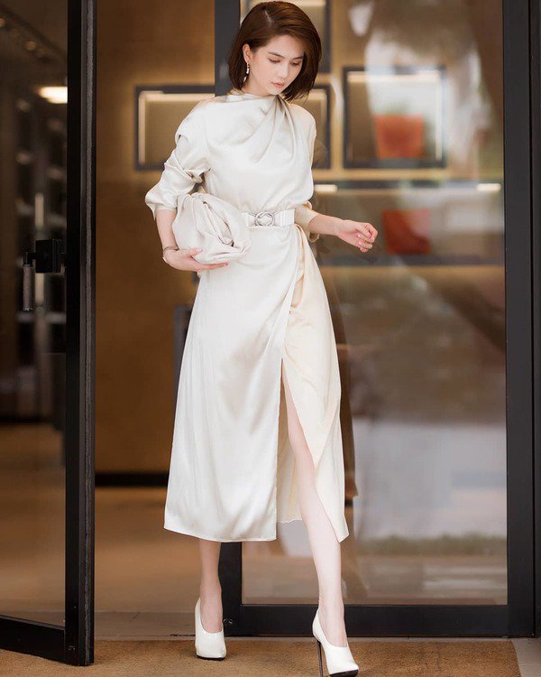 Ngọc Trinh cũng nhanh chóng bắt kịp trend khi tậu luôn một dáng túi dây rút màu trắng xuyệt tông cùng bộ váy của mình đi khi đi dạo phố
