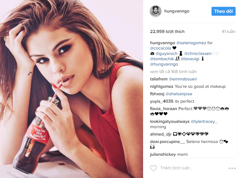 Và không thể thiếu Selena Gomez, được xem là “mối ruột” của Hùng. Trên tài khoản cá nhân, Hung vanngo đã chia sẻ nhiều khoảnh khắc cô nàng từ mỗi lần hợp tác. Qua bàn tay Hùng, “cô phù thủy xứ Waverly” ngày nào đã trở nên rực rỡ với hàng tá hình ảnh “triệu like”.