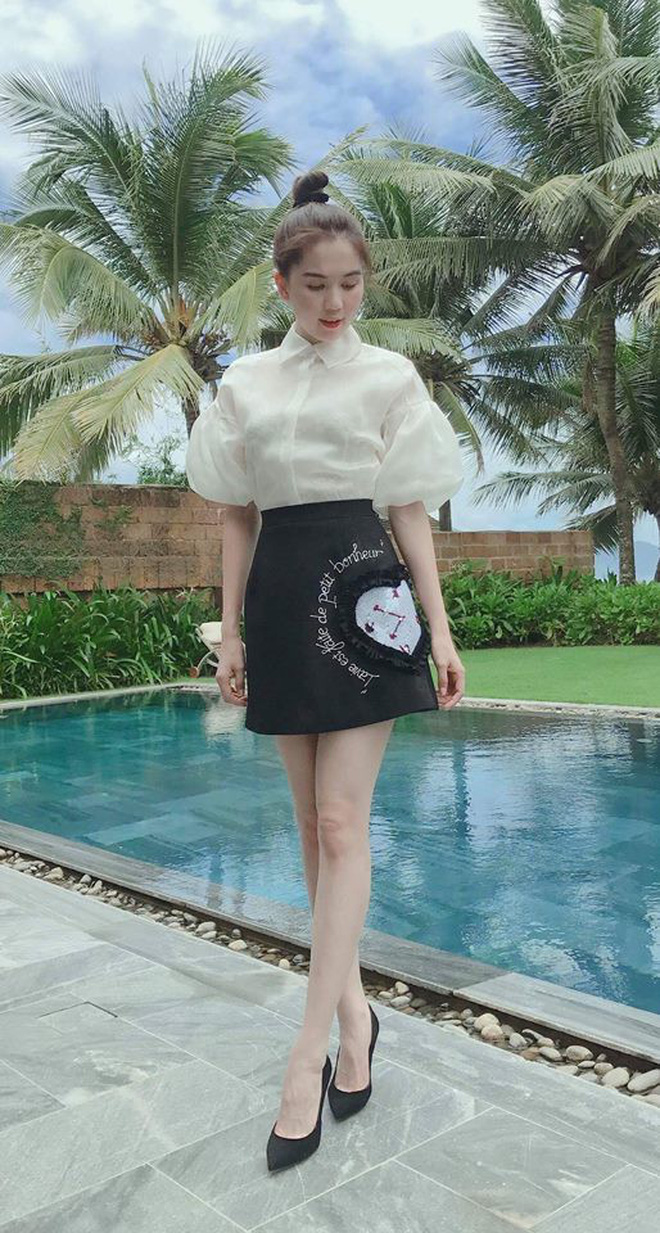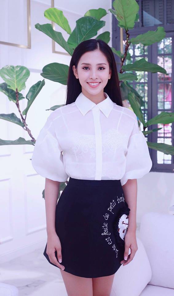 Tân hoa hậu Việt Nam 2018 diện áo sơ-mi voan tay bồng với chân váy đen ngắn thêu đính