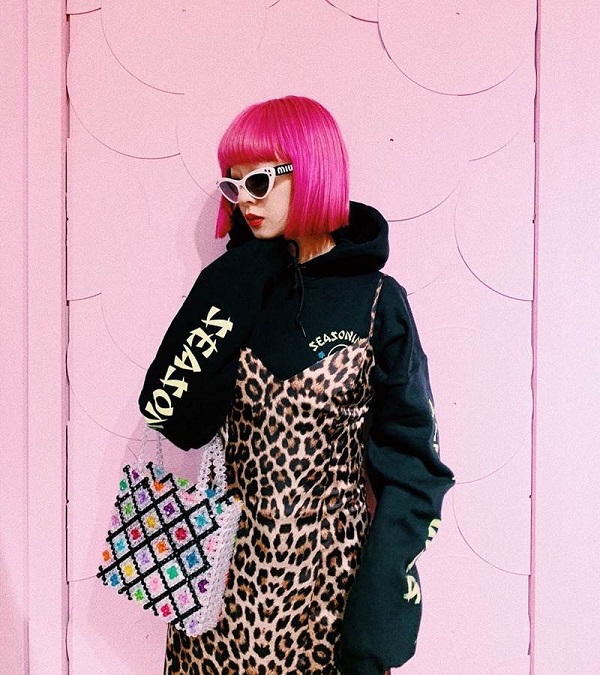 Nàng Fashionista Ami Suzuki chất “lừ” trong layer đầm da báo bên ngoài mặc bên trong chiếc áo hoodie lạ mắt cùng kiểu tóc bob hồng nổi bật mix cùng chiếc túi kết hạt