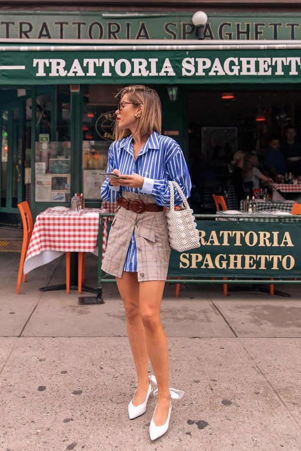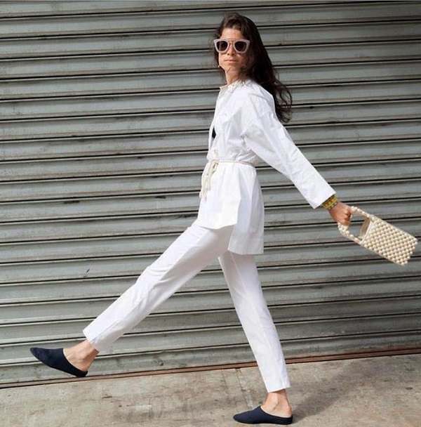 Stylist Linda Tol chọn cho mình chiếc túi kết hạt màu be mix cùng trang phục nữ tính của mình với áo blazer cộng đầm trắng