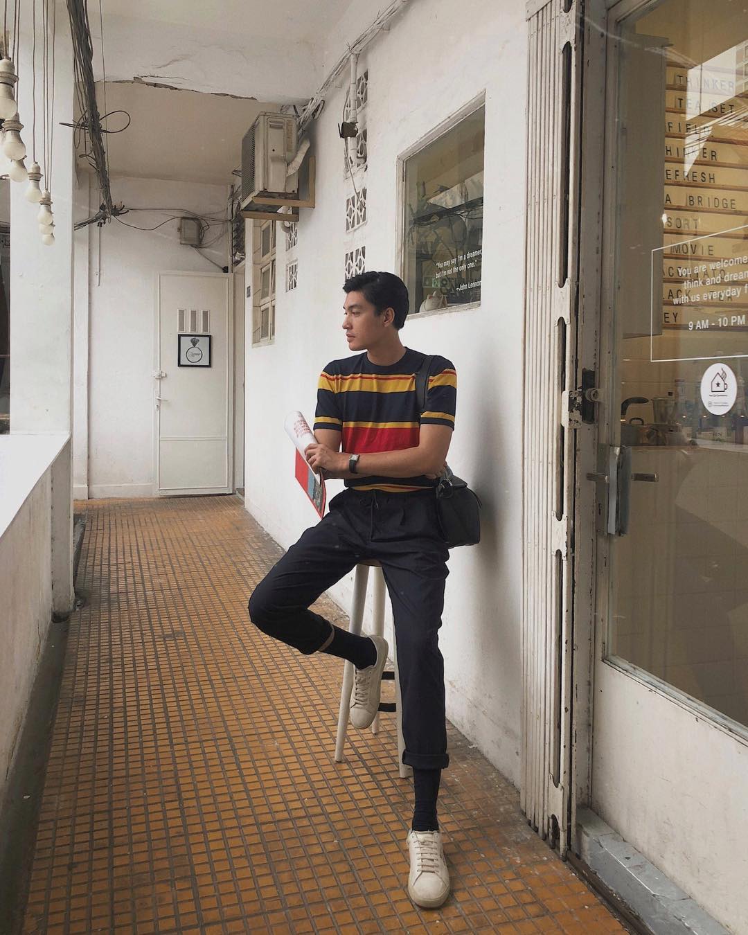 Diễn viên Duy Khánh Zhou Zhou đáng yêu, tươi trẻ cùng set đồ màu sắc. Anh chàng không quên sử dụng đôi giày Archlight Louis Vuitton đang “hot” làm điểm nhấn.