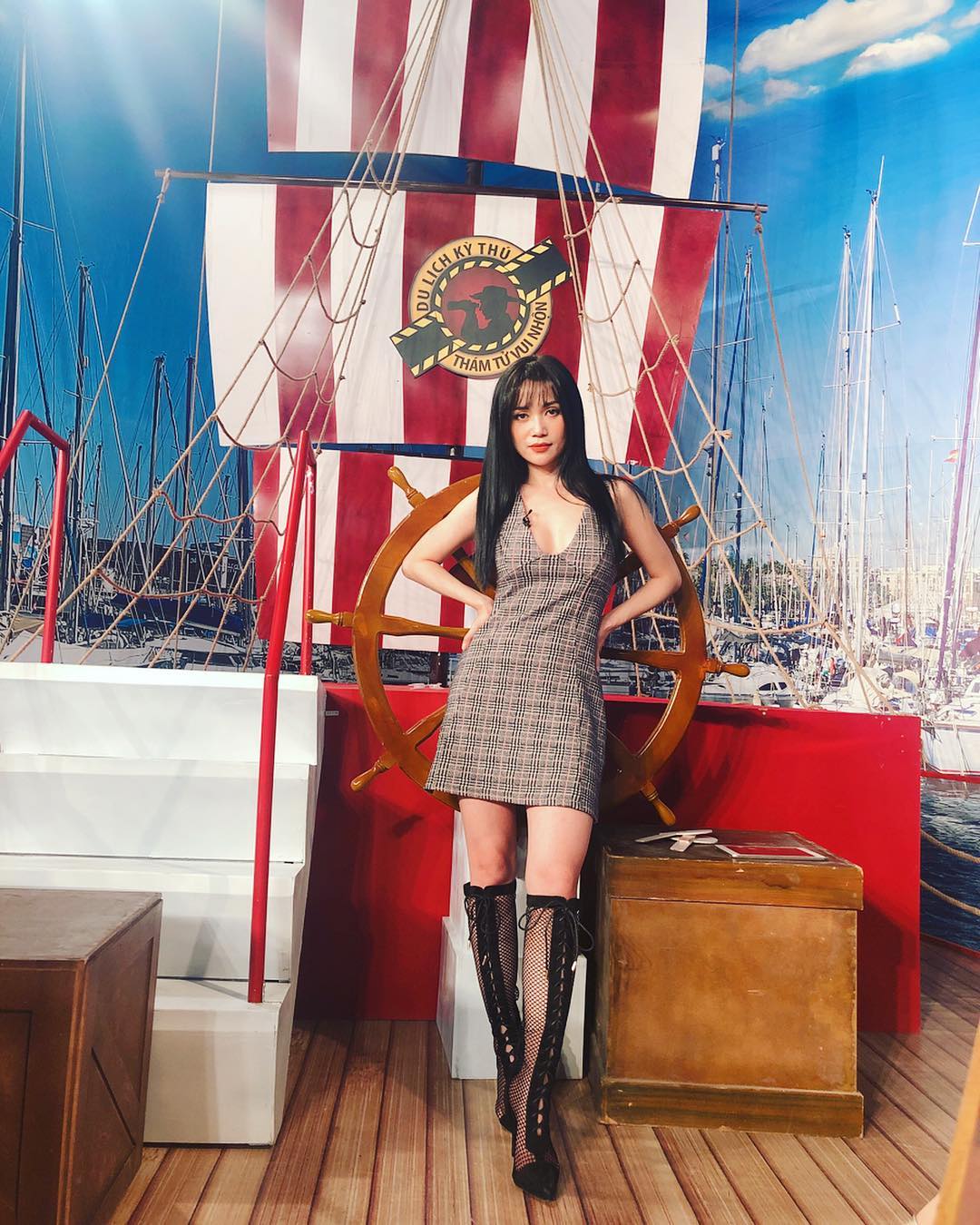 Nhằm tránh việc trở nên nhạt nhòa trong bộ váy ngắn đơn điệu, Sĩ Thanh đã nâng tầm phong cách cùng đôi boots lưới ấn tượng.