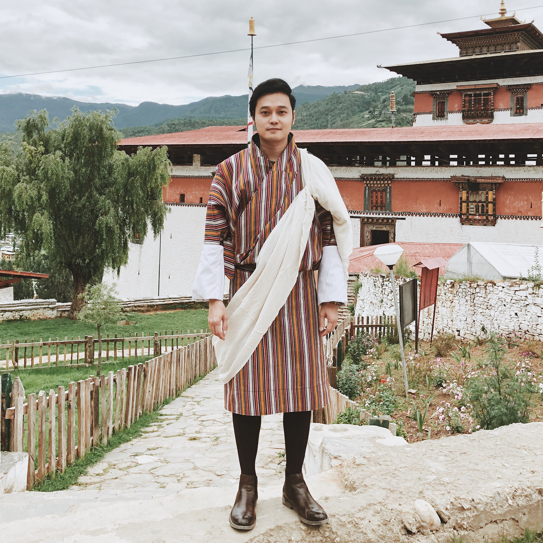 Ca sĩ Quang Vinh đang tận hưởng những ngày nghỉ thoải mái tại Bhutan. Anh chàng không bỏ qua cơ hội được diện set đồ truyền thống của vùng đất này.
