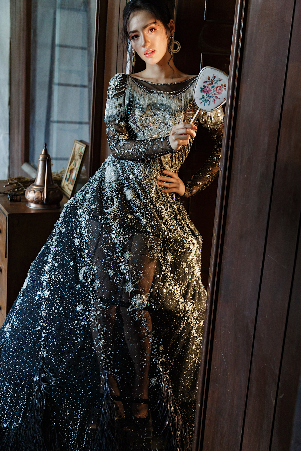 Điểm nhấn của những thiết kế này nằm ở họa tiết ánh kim. Những chiếc váy được đính kết khéo léo theo kỹ thuật 3D tạo nên sự bắt mắt, nổi bật cho người mặc.