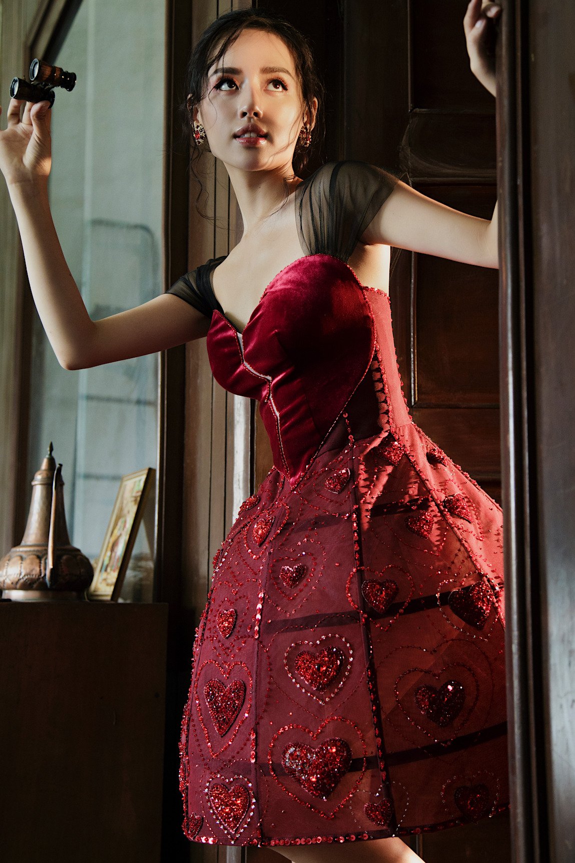 Thiết kế mang sắc đỏ giúp chân dài khoe lợi thế hình thể cũng như thể hiện sự mãnh liệt, cuồng nhiệt trong tình yêu thông qua họa tiết trái tim.