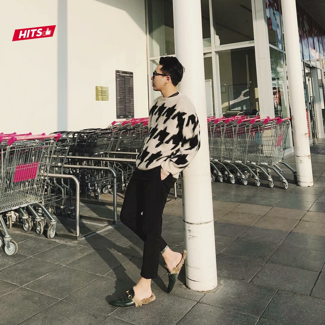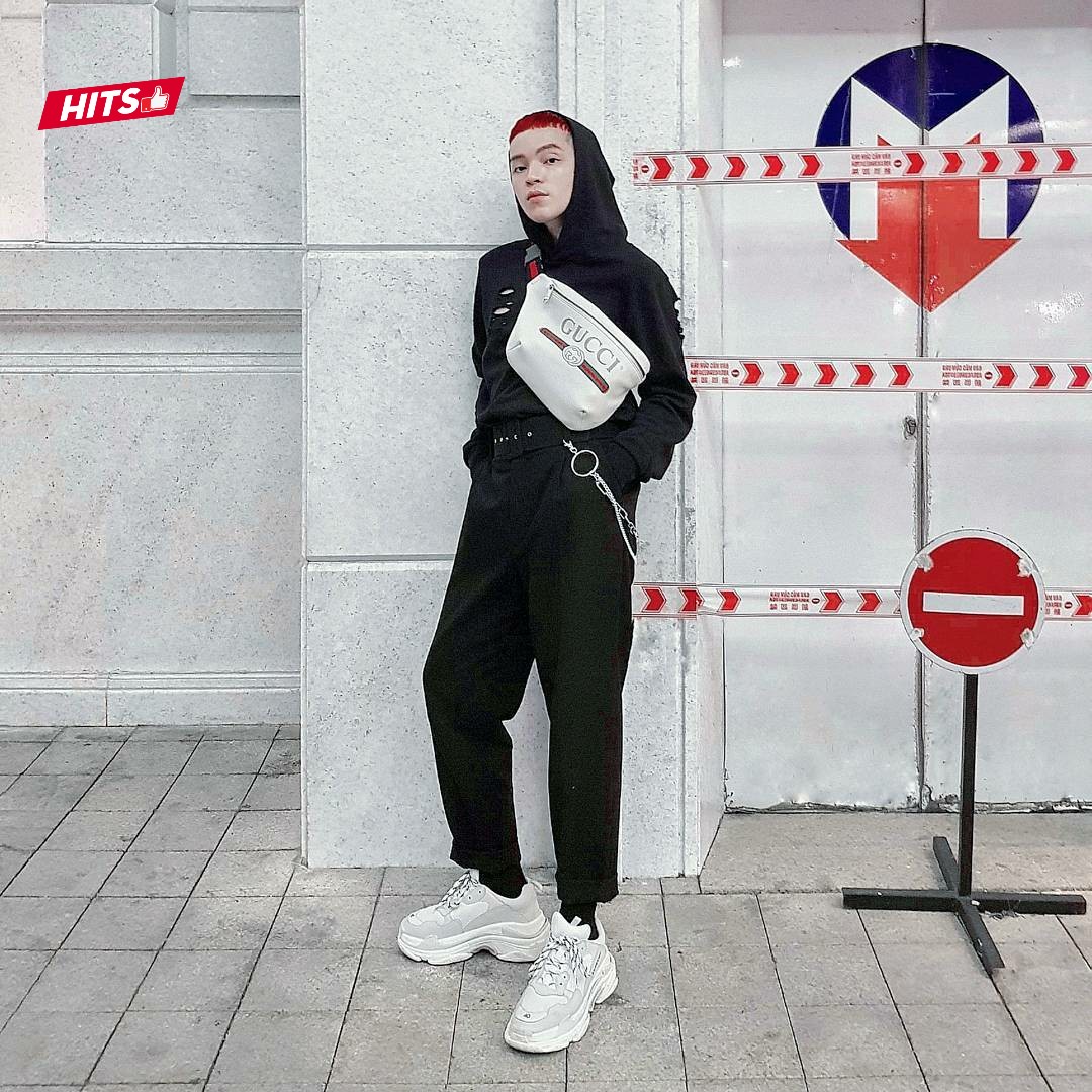 Kelbin quả không hổ danh là một stylist hàng đầu. Set đồ allblack tưởng chừng như sẽ nhàm chán, kém nổi bật lại được Kelbin “cao tay” phối hợp phụ kiện túi Gucci cùng giày Balenciaga thời thượng, đem đến tổng thể hoàn hảo.