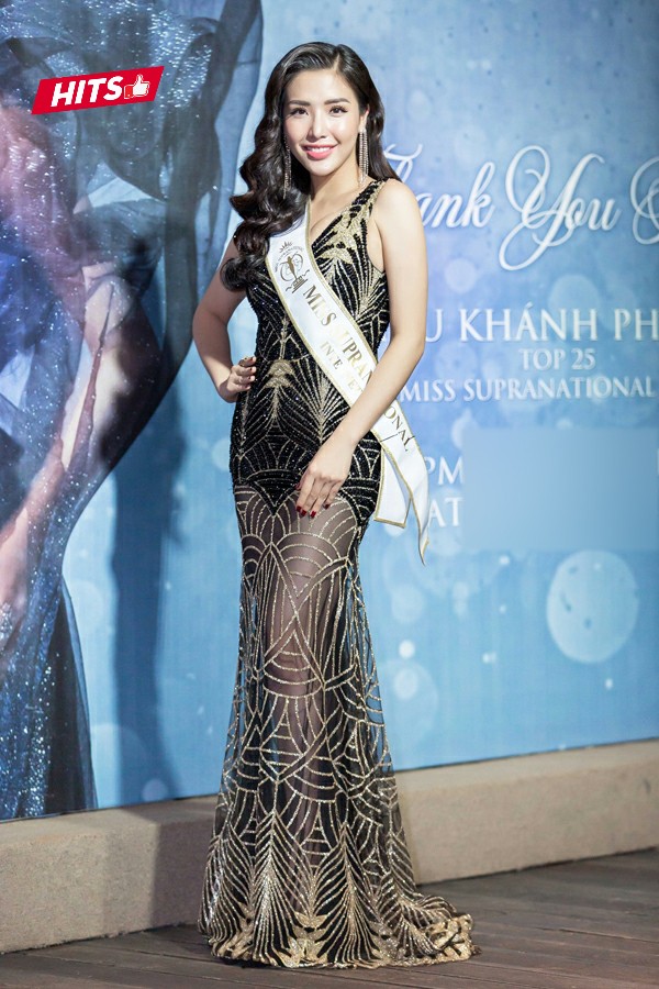 Trong đêm tiệc cảm ơn của mình, Khánh Phương đã diện mẫu váy đuôi cá ôm sát khoe trọn hình thể. Chất liệu xuyên thấu cùng gam màu ánh kim khiến đại diện Việt tại cuộc thi Miss Supranational 2017 ghi điểm cùng phong cách quyến rũ, gợi cảm.