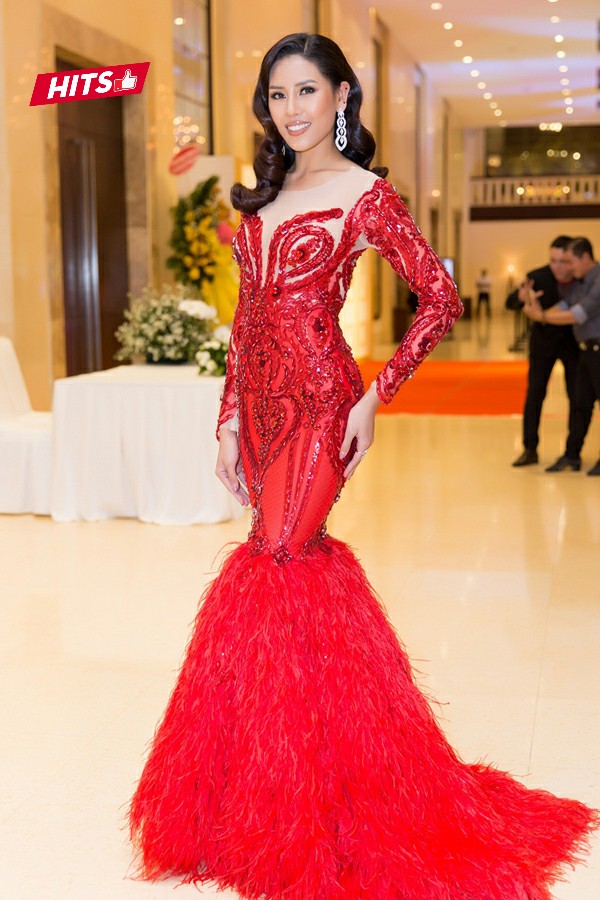 Nguyễn Thị Loan ghi dấu ấn trong chiếc đầm đuôi cá đỏ rực. Cách đính kết lông vũ cùng đá lấp lánh đem đến độ mềm mại, duyên dáng khi người đẹp di chuyển. Tiếp tục bắt nhịp khi kết hợp phụ kiện hoa tai bản lớn và tóc uốn sóng, Nguyễn Thị Loan ghi điểm tuyệt đối trong mắt khán giả.