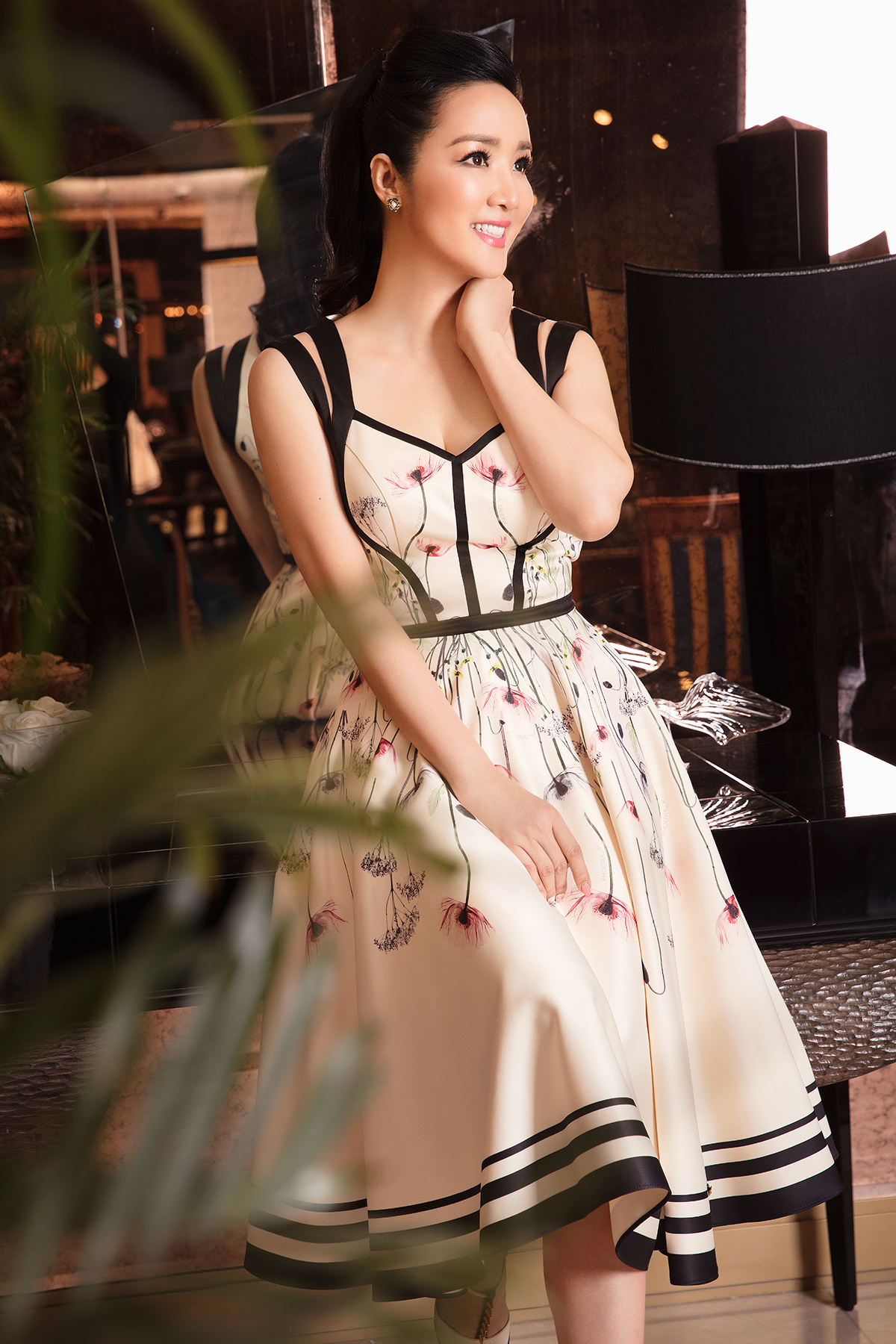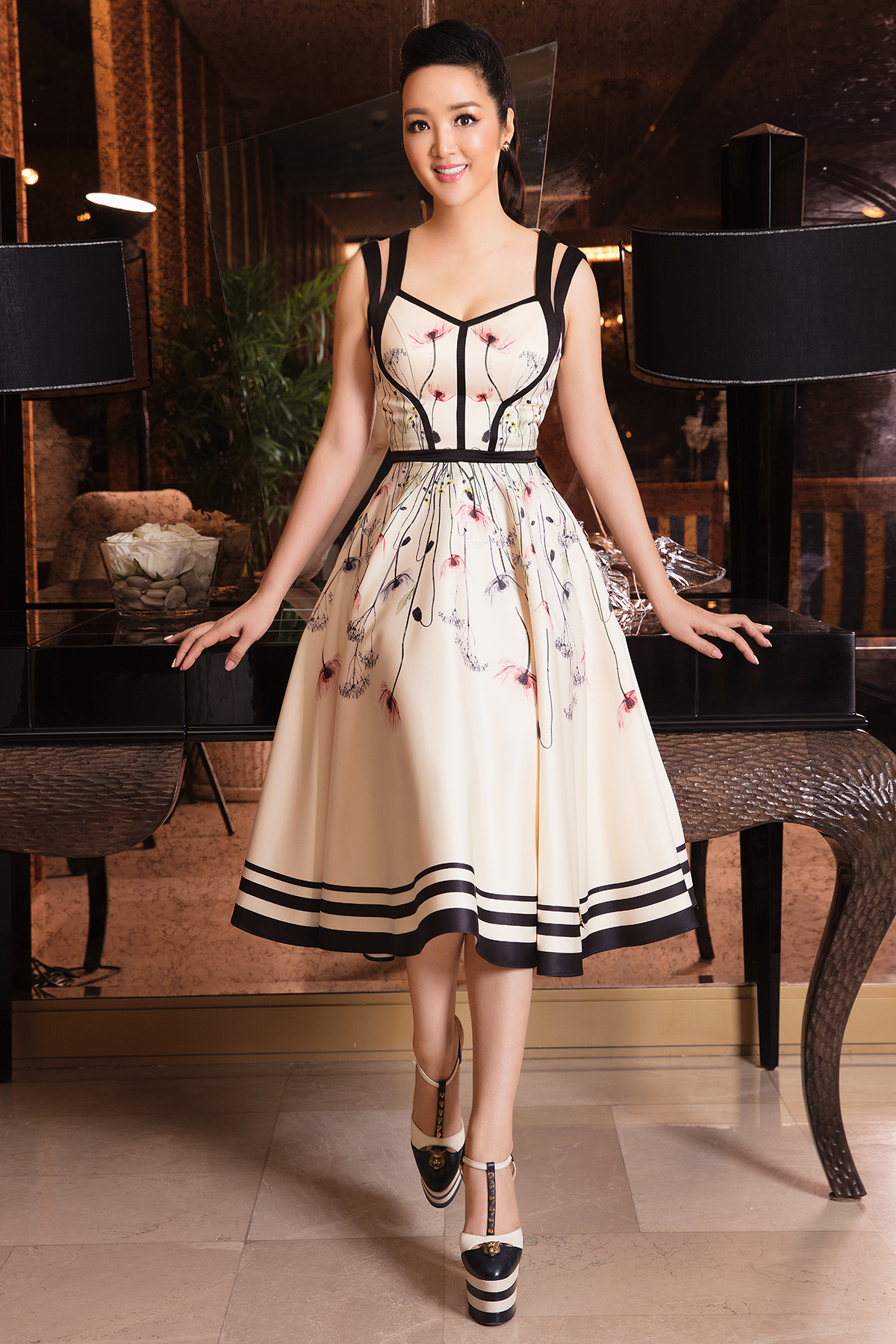 Trong ảnh, Giáng My chọn kiểu tóc “đuôi gà” khá ăn nhập với thiết kế sang trọng. Bộ cánh được tối giản với màu nude nhẹ nhàng và hoạ tiết sọc hiện đại tạo nên hình ảnh quý cô cổ điển.