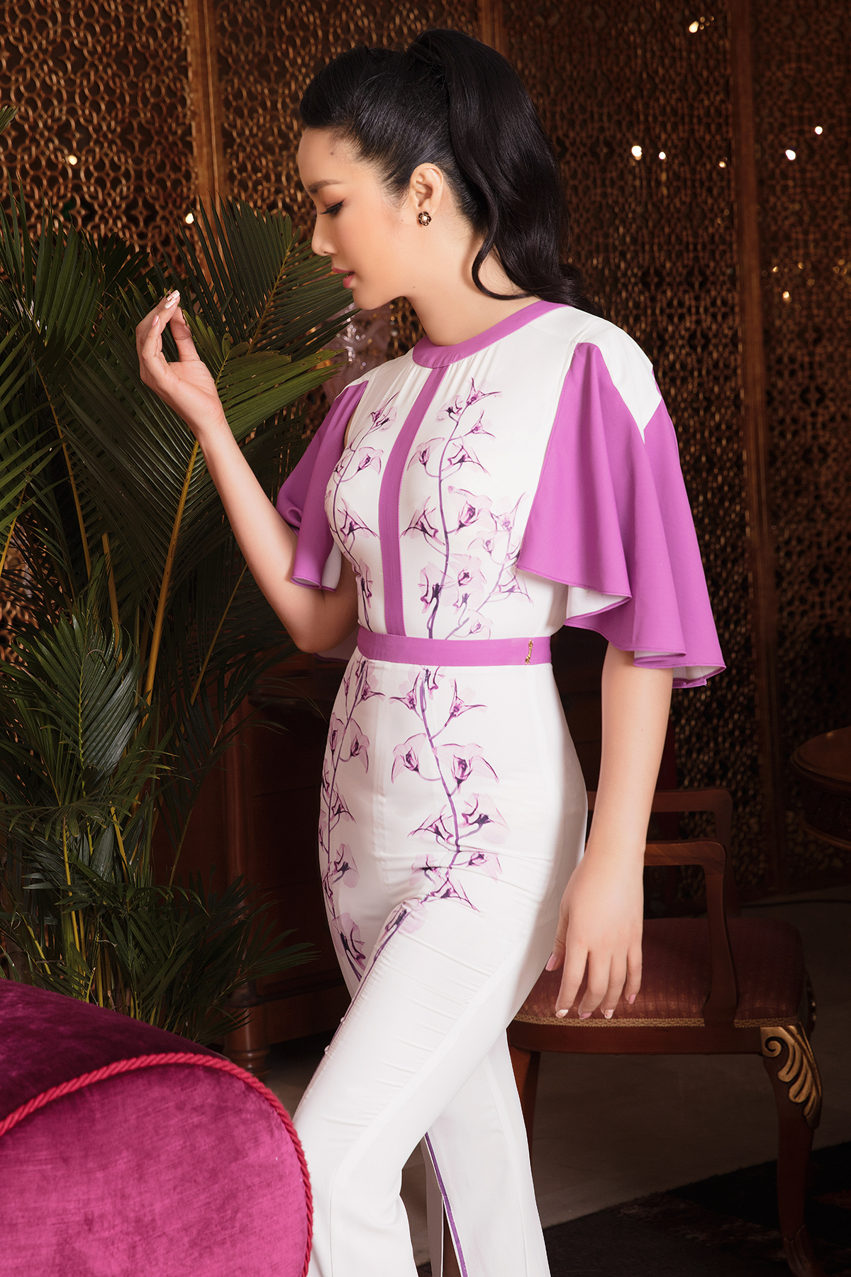 Giáng My lựa chọn thiết kế tông trắng ôm sát vóc dáng khoe đường cong. Điểm nhấn là những bông hoa thêu trên mặt trang phục thật duyên dáng và ăn nhập phần tay áo hồng xoè.