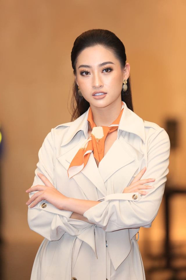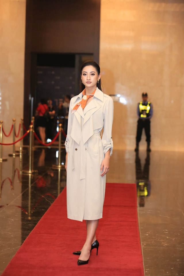 Kiểu váy áo măng tô dài , tô điểm thắt nơ cam ngay cổ giúp Lương Thùy Linh trông vô cùng kiêu sa và thanh lịch như một quý cô Pháp