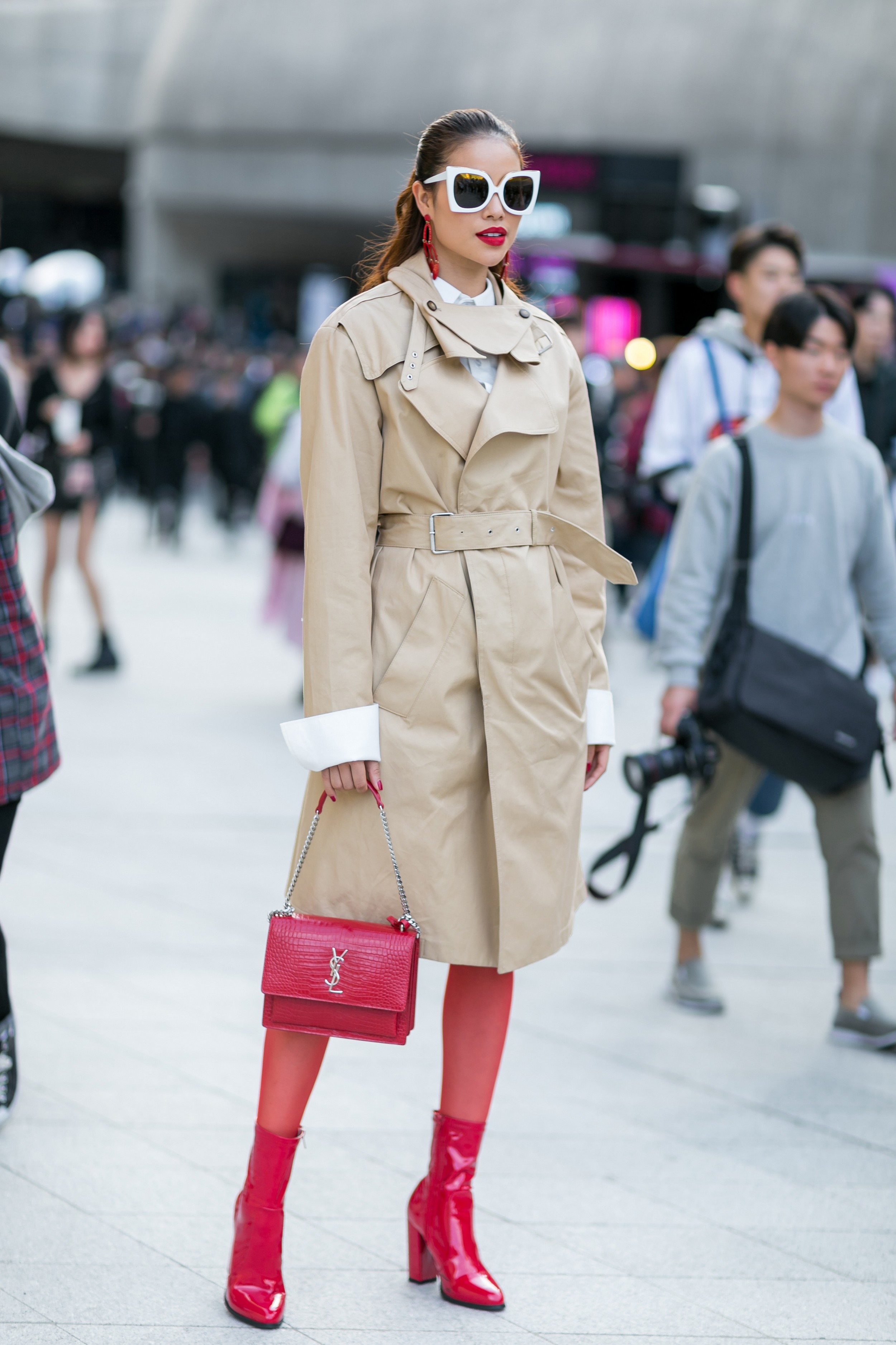 Điểm nhấn chính là đôi boots đỏ của Monki xuyệt tông cùng túi Yves Saint Laurent và mắt kính to bảng của Linda Farrow.