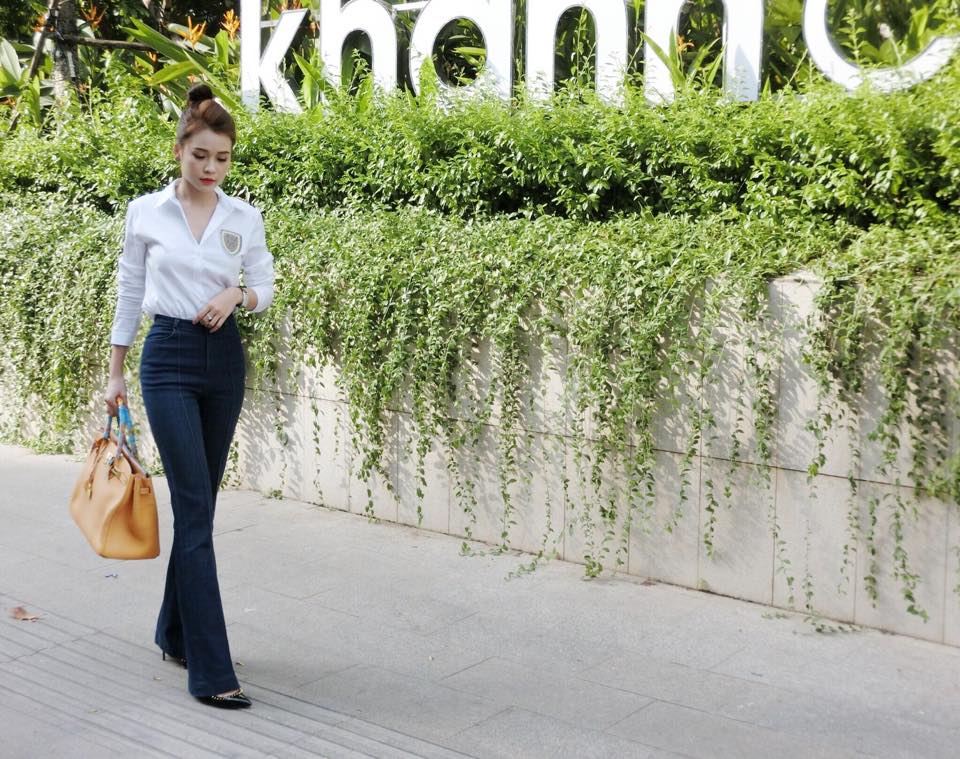 Diện sơ mi basic với quần jeans ống loe, Sam khoe khéo đôi chân dài thẳng tắp.
