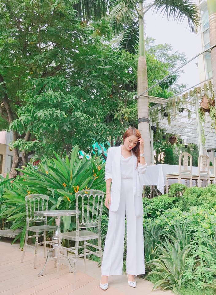 Có lúc cô lại hóa thân thành quý cô lịch lãm với bộ suit trắng tinh khôi.