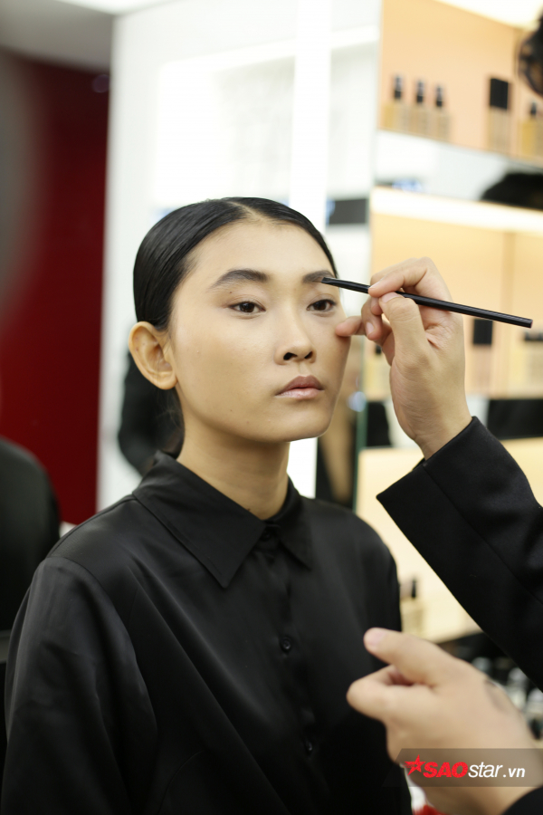 Ở một vị trí khác, người mẫu Kim Nhung đang được make up artist họa mặt để chuẩn bị cho sự kiện.