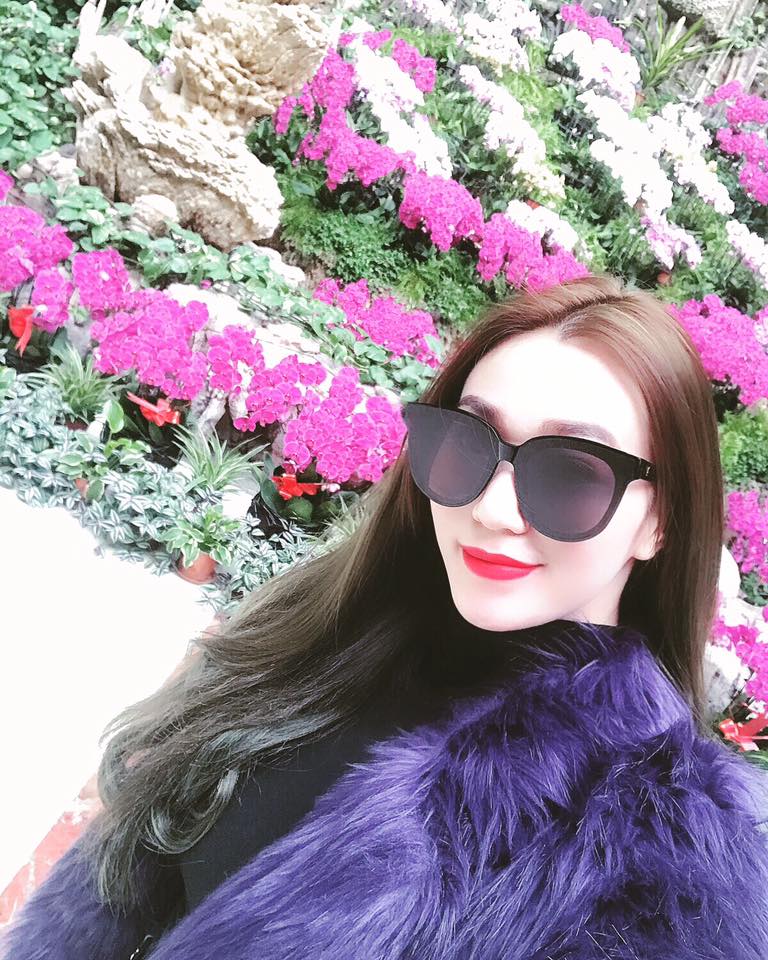 Khánh My luôn sành điệu và nổi bật tại bất kì đâu. Trong ảnh, Khánh My diện áo khoác lông màu tím ấm áp và cực kỳ sang chảnh.