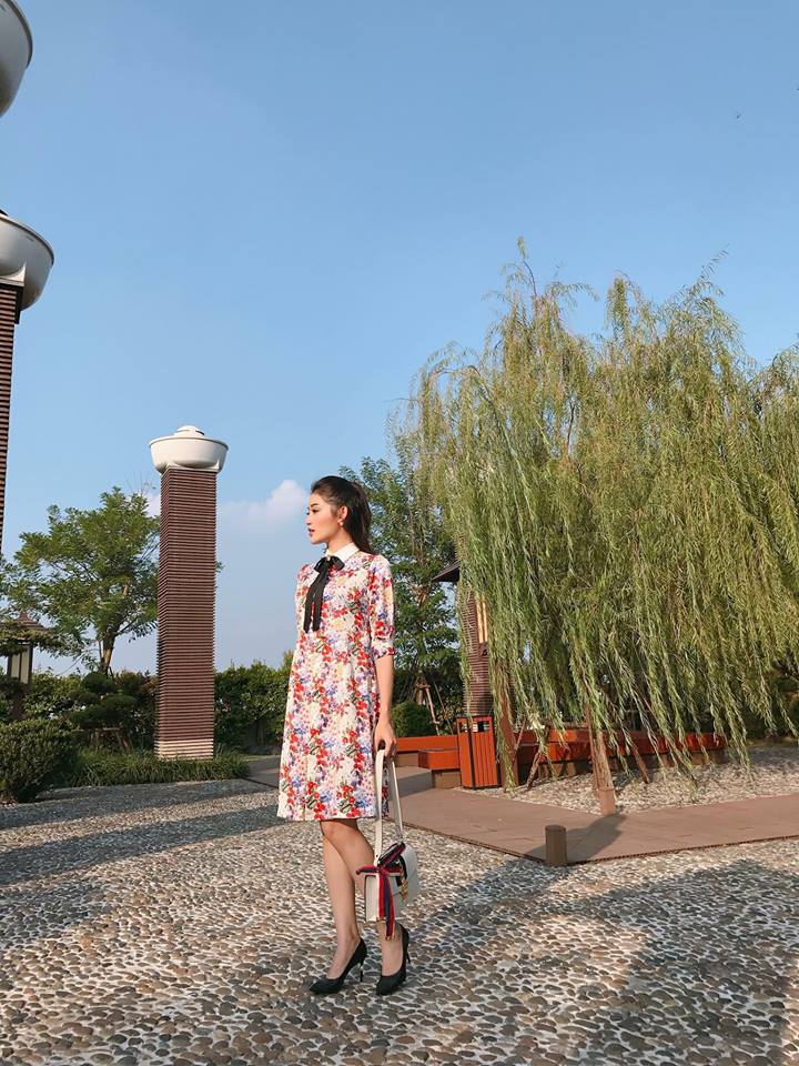Á hậu Huyền My cũng chọn một chiếc váy hoa nhí nền trắng thanh lịch. Cô nàng kết hợp chiếc váy với xúi xách trắng và giầy đen ăn rơ.