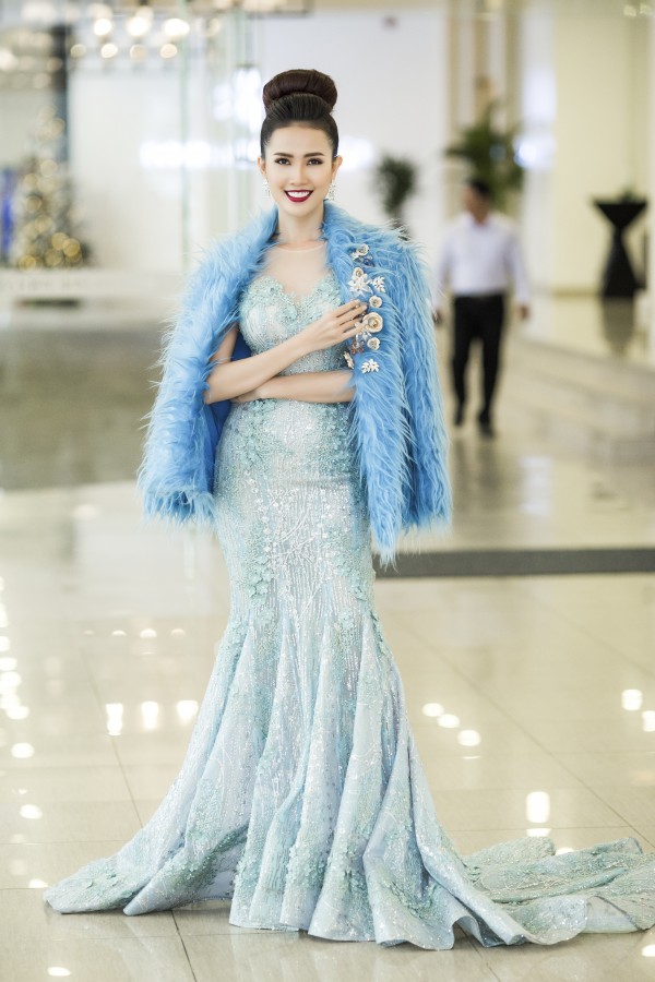 Diện váy đuôi cá lộng lẫy và áo khoác lông màu xanh, Phan Thị Mơ thật biết cách khiến mình trở nên nổi bật giữa sự kiện.
