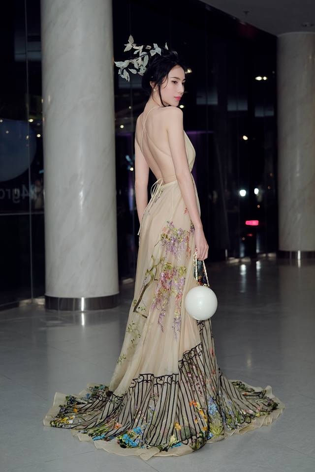 Ca sĩ Thủy Tiên phối mẫu đầm xuyên thấu, chất liệu lụa organza cùng phụ kiện túi trái banh Chanel màu trắng