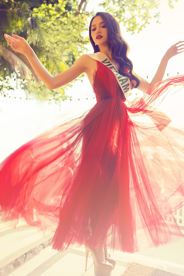 Trước đó, khi tham gia hoạt động bên lề cuộc thi vào ngày 6/3 Hương Giang cũng khiến người đối diện không thể rời mắt khi lựa chọn chiếc váy xòe bằng vải voan đỏ của NTK Đỗ Mạnh Cường. Cách xử lí tinh tế khiến chiếc váy có được những mảng miếng dày, mỏng khác nhau, làm nên vẻ đẹp quyến rũ cho người mặc.