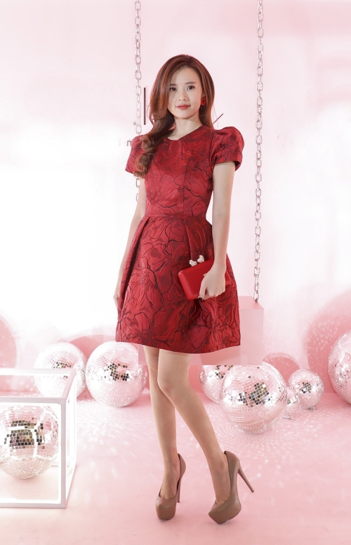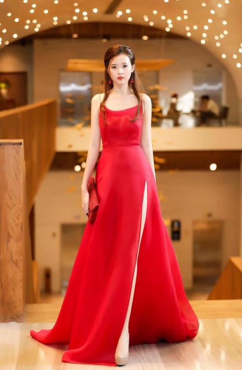 Tiếp tục là một chiếc váy đỏ khác của Midu, chất liệu gấm taffta giúp trang phục có độ đơ vừa phải, không làm xấu dáng người mặc. Người đẹp phối cùng clutch đỏ và cao gót màu beige, nhằm hoàn thiện tổng thể.