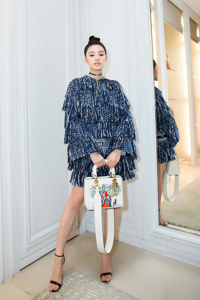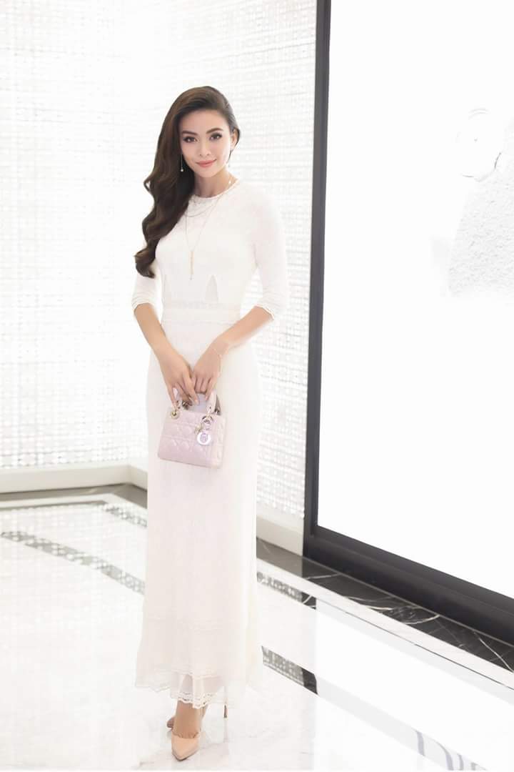 Mâu Thủy khoe vẻ đẹp ngọt ngào, nữ tính đúng chất hoa hậu. Cô nàng lựa chọn chiếc váy trắng dài ôm sát, đi cùng túi xách Lady Dior đắt giá.