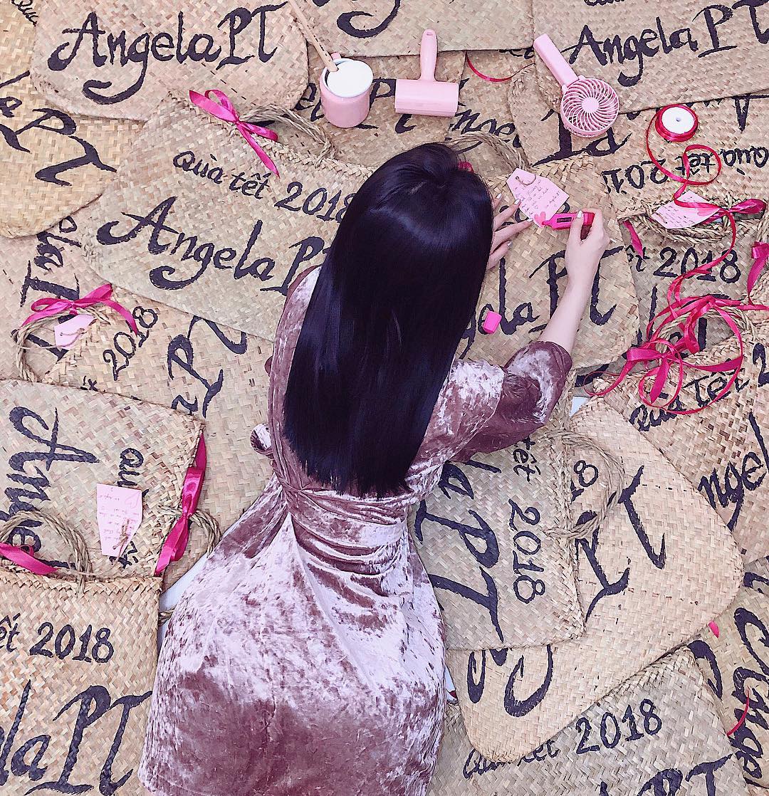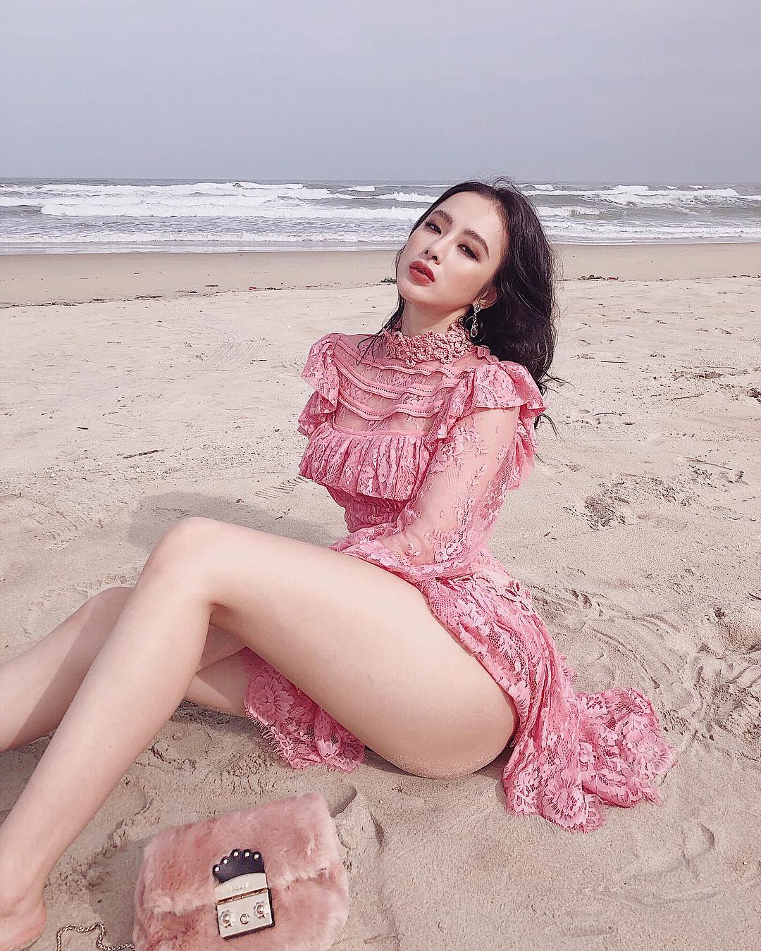 Diện váy ren dún hồng bèo nữ tính, phía trước là túi lông cùng tông. Có thể chắc chắn rằng, nếu bảo Angela Phương Trinh là người đẹp mê mệt sắc hồng nhất thì cũng chẳng sai được.