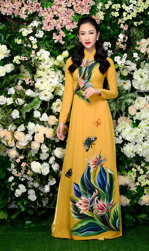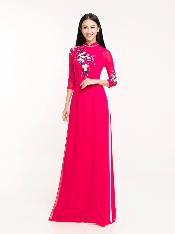 Với niềm mê đắm trang phục truyền thống của dân tộc, trong giai đoạn cận kề và rất bận rộn với các hoạt động tại cuộc thi Hoa hậu Đại dương 2017, Á hậu vẫn dành thời gian để làm người mẫu cho một bộ sưu tập áo dài mới của NTK Minh Châu.