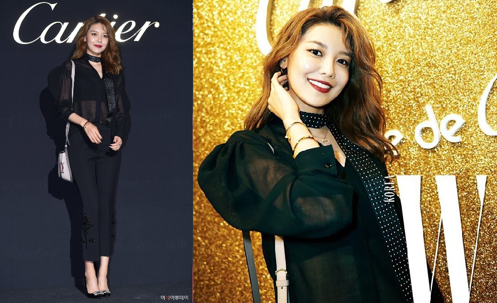Đối với đồ hiệu, Sooyoung vẫn tôn thờ sự thanh lịch, đơn giản màu trong màu sắc. Tham dự buổi ra mắt thương hiệu thời trang Boon The Shop x Cartier, nàng đẹp một cách sang chảnh trong áo voan tay bồng của nhà mốt Saint Laurent mix cùng quần suông, các items đi cùng đều cùng một màu đen quý phái. Đặc biệt chiếc khăn chấm bi đã làm bật lên cả set đồ.