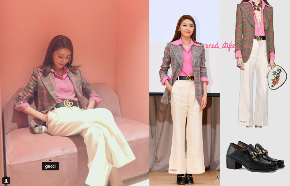 Cô nàng mặc đẹp cả cây Gucci “dễ như ăn kẹo”, jacket caro mang phong thái cổ điển mix cùng sơ mi hồng, quần ống loe và guốc đế thô. Đặc biệt, thắt lưng khắc logo Gucci khiến bộ trang phục trở nên đẳng cấp.