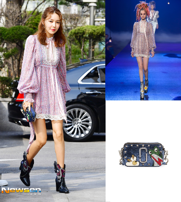 Sooyoung luôn hướng đến sự nền nã trong phong cách ăn mặc, với chiếc váy baby doll của Marc Jacob cũng vậy. Cô nàng có chút phá cách khi mix cùng boots cá tính và ví cầm tay họa tiết.