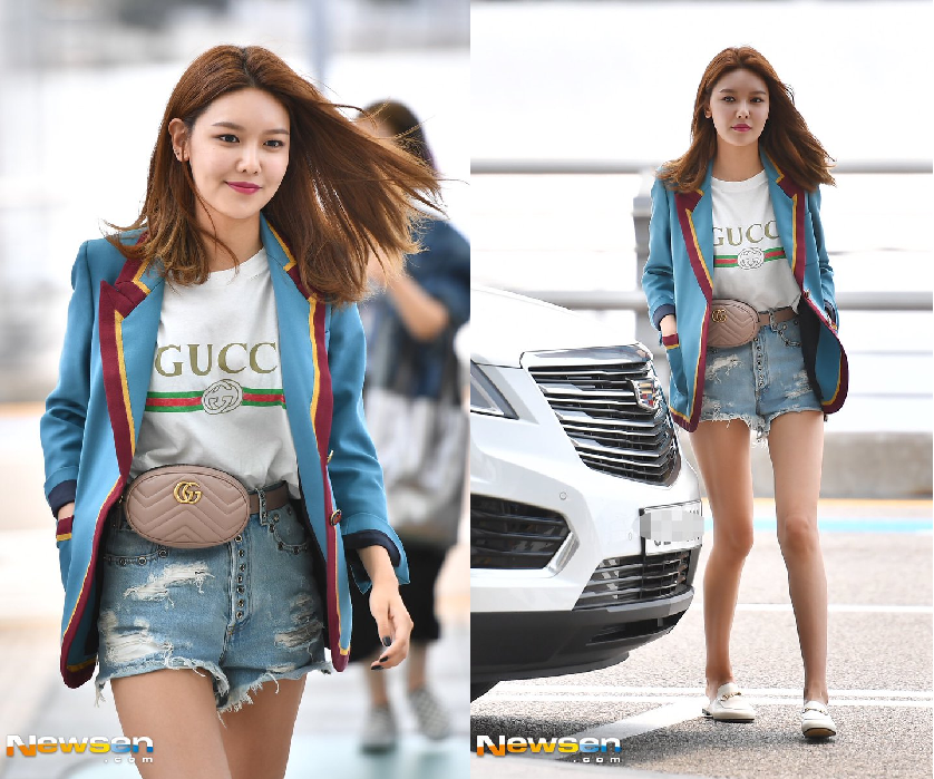 Sooyoung xuất hiện tại sân bay để lên đường tham dự show ra mắt bộ sưu tập của nhà mốt Gucci - GUCCI' 2018 Cruise tại Italia. Cô nàng diện hẳn một cây của thương hiệu này và chứng tỏ khả năng phối đồ tinh tế: áo phông logo, vest xanh nền nã, short jeans rách trong bộ sưu tập Thu Đông 2017. Đặc biệt nổi bật với các phụ kiện như túi đeo hông và giày slipper đình đám.