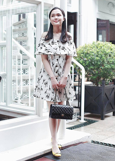 Được biết đến với hình ảnh nhẹ nhàng, thục nữ, tủ đồ của Quỳnh Anh cũng không thiếu những chiếc váy mang màu sắc nhã nhặn, điểm xuyết bằng họa tiết hoa. Thay vì chọn váy áo gợi cảm như những nàng hot girl cùng tuổi, 9X trung thành với kiểu “kín cổng cao tường”, xếp ly bung xòe và không quên tạo điểm nhấn cho vẻ ngoài bằng túi hàng hiệu đắt đỏ. Chiếc túi Lady Dior có giá hơn 3.000 USD được cô ưa chuộng vì dễ kết hợp với váy nữ tính.