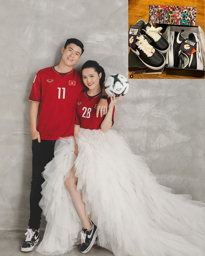 Cặp đôi thường xuyên bắt trend những xu hướng ăn mặc mới nhất của giới trẻ, mới nhất cả hai cùng khoe giày đôi hoa cúc Nike Air Force 1 x PEACEMINUSONE Para-nois.