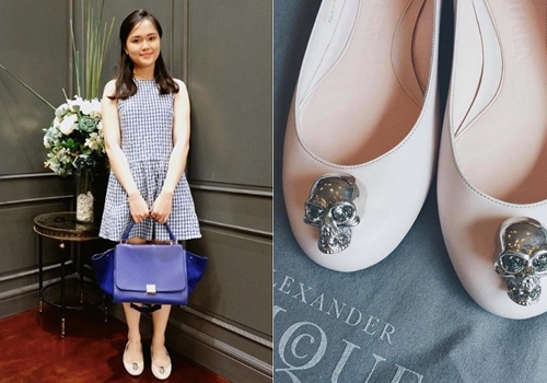 Với gu mặc nữ tính, Quỳnh Anh khá chuộng kiểu giày búp bê, trong đó có mẫu giày đính đầu lâu cá tính của Alexander McQueen.