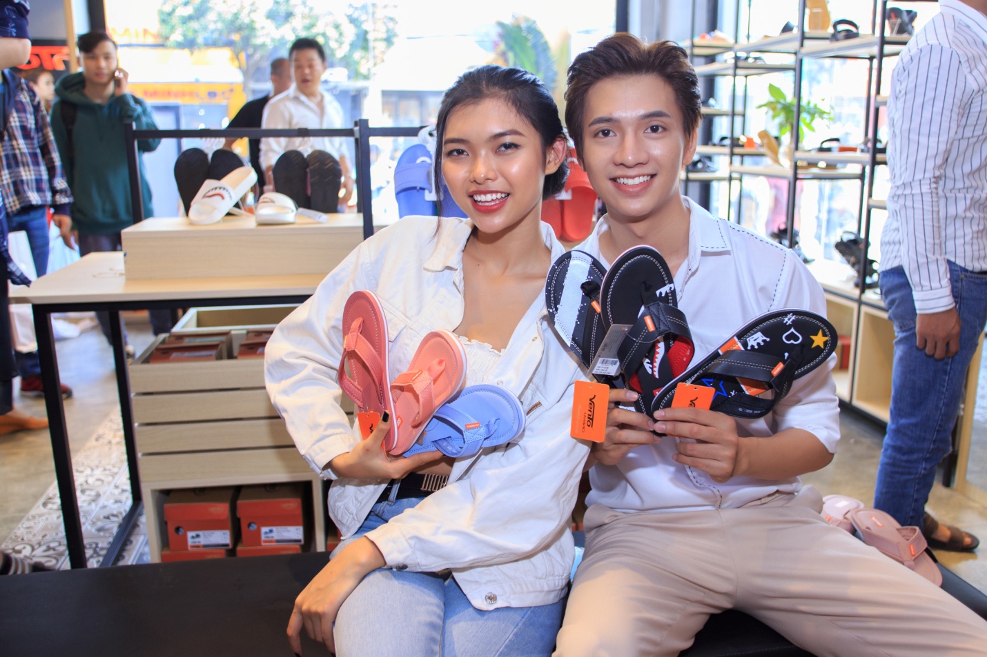 Là 2 gương mặt mẫu nam sáng giá Tường Khoa và Hải Đăng quan tâm nhiều nhất đến dòng giày thể thao để phục vụ việc luyện tập cũng như di chuyển hằng ngày. Cả hai mẫu nam đều không giấu được sự thích thú dành cho dòng sản phẩm giày hỗ trợ tăng cường hoạt động thể thao, ngoài trời và bảo vệ sức khỏe do được sản xuất hoàn toàn từ nguyên liệu xanh thân thiện môi trường tại cửa hàng.