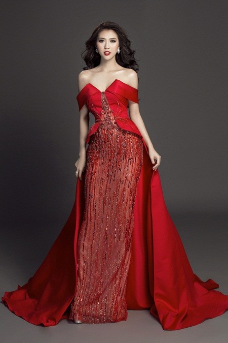 Ngoài ra còn được đính tỉ mẩn bởi hàng ngàn viên đá swarovski, pha lê cao cấp và tạo hình thành những ngọn lửa cách điệu trên một bố cục, tổng thể chặt chẽ tôn lên vẻ đẹp cũng như sự tỏa sáng cho Tường Linh.