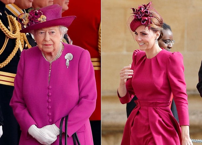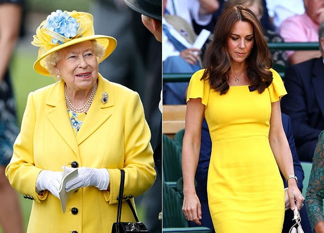 Không chỉ riêng nữ hoàng mà ngay nàng công nương Kate Middleton cũng nhiều lần được fan hâm mộ bắt gặp những bộ cánh y rực rỡ y chang Người đàn bà quyền lực nhất trong Hoàng gia Anh.