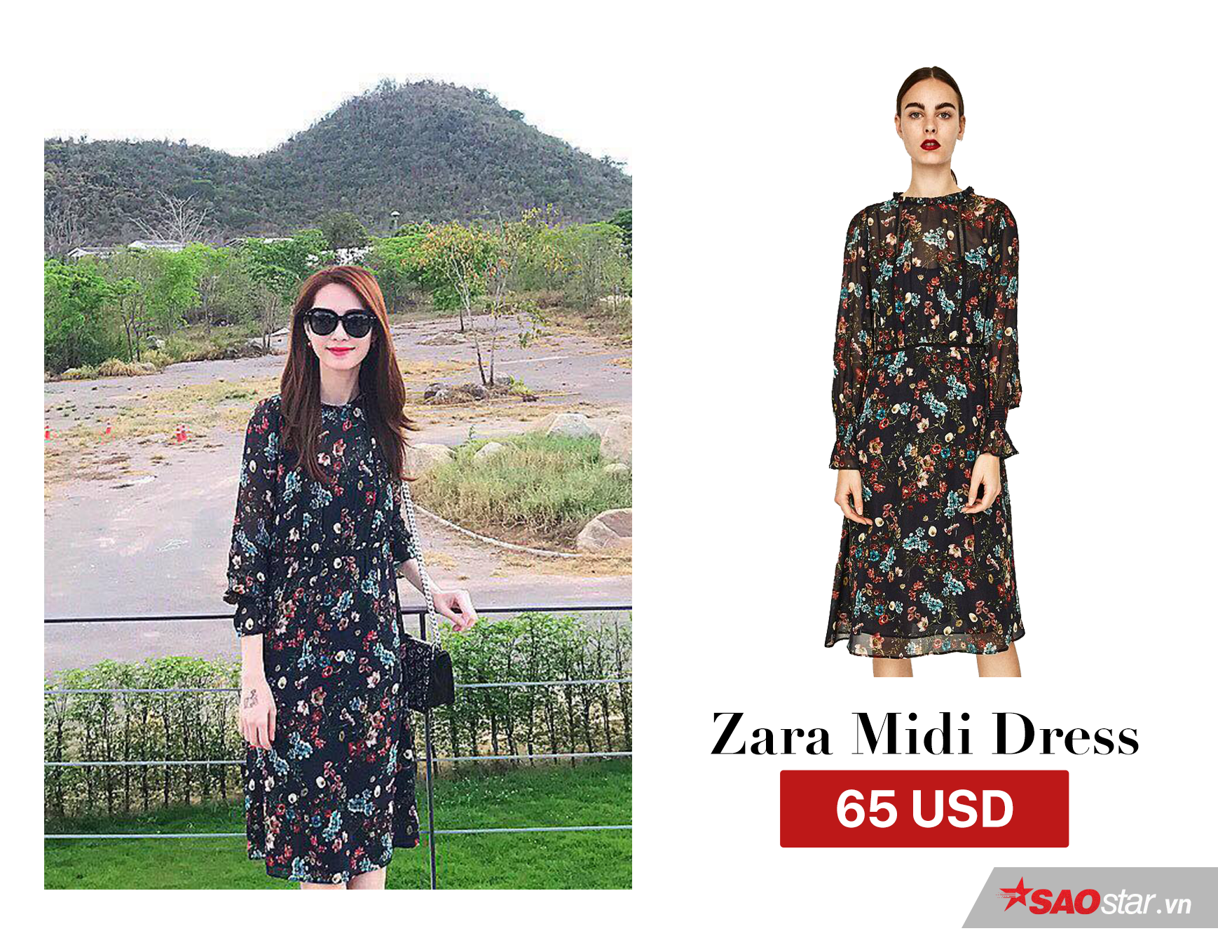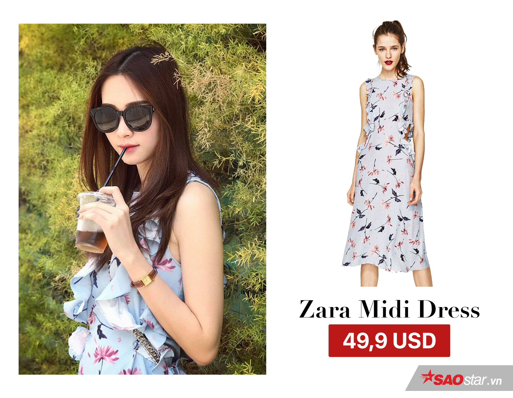 Ngoài thích diện đồ giá bình dân thì người đẹp xứ Bạc Liêu còn là một fan lớn của thương hiệu Zara. Cô đón đầu xu hướng thời trang mùa Hè năm nay bằng cách rất chăm chỉ diện những thiết kế váy họa tiết hoa đáng yêu và nữ tính. Đây cũng chính là items được các tín đồ ưa chuộng và săn lùng ráo riết trong suốt thời gian qua. Giá của mỗi trang phục cô diện đều nằm trong khoảng từ 500 nghìn tới 1,5 triệu đồng.