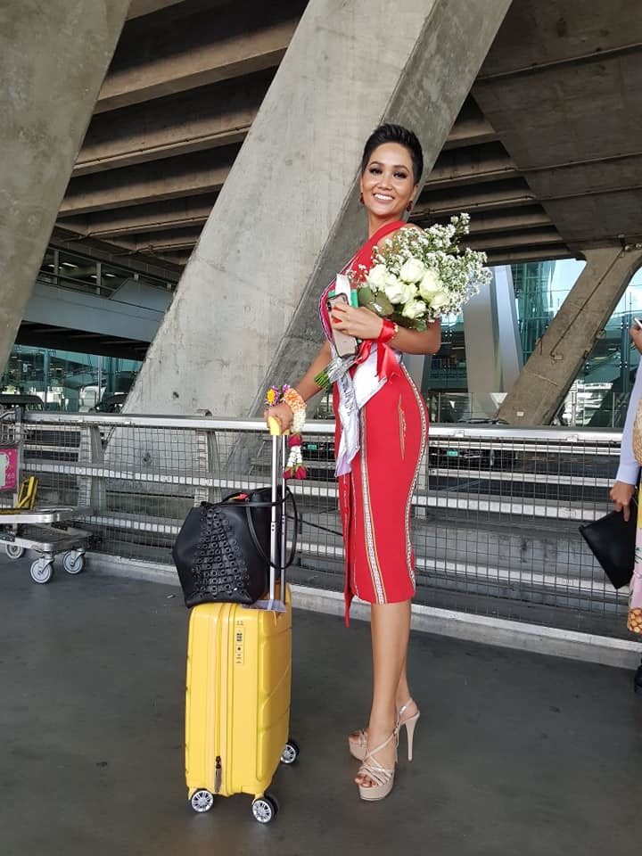Ngày đầu tiên khi vừa đáp chuyến bay xuống Băng Cốc, H'Hen Niê chọn đầm lệch vai được trang trí bằng những chi tiết làm từ chất vải thổ cẩm của người Ê Đê - quê hương cô. Và đây là thiết kế mở màn trong chuỗi những chiếc váy ngắn của H'Hen Niê.