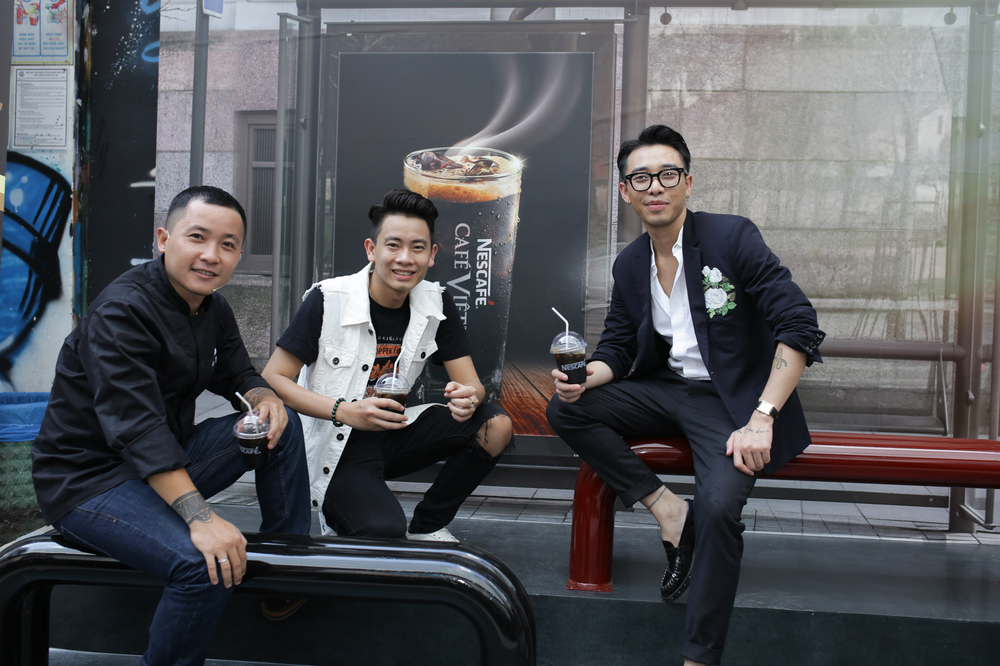 Hoàng Ku, DJ Hưng 88 và Chef Cẩm Thiên Long chuyện trò vui vẻ bên ly cà phê Nescafé Café Việt Cà phê rang xay hòa tan.