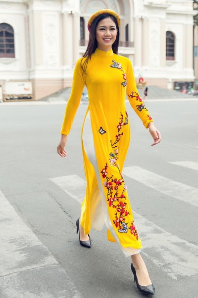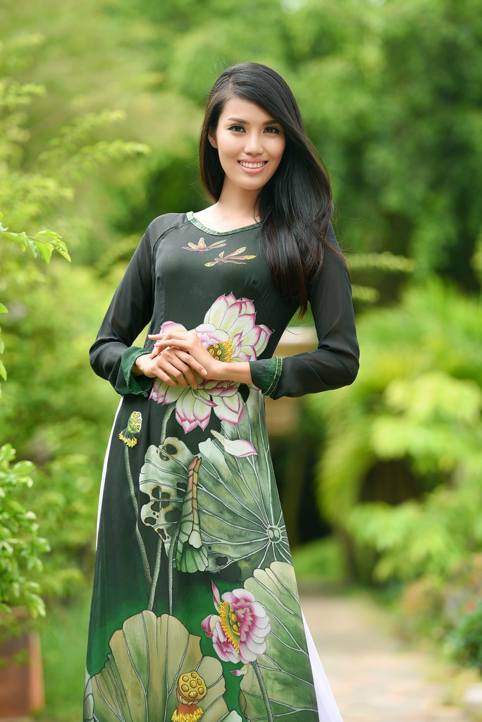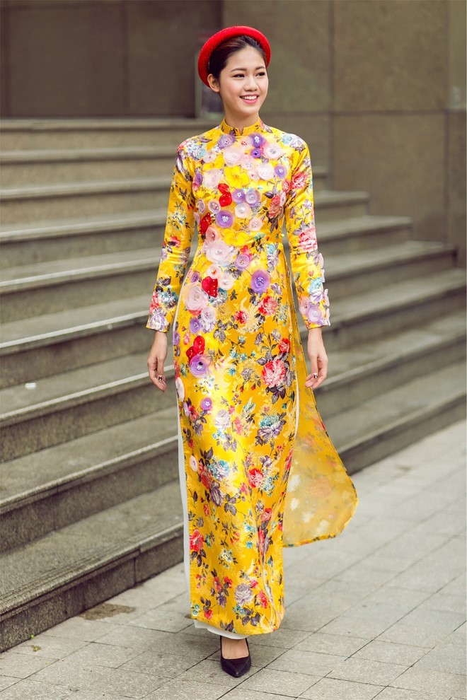 Với những cô nàng thích sự đơn giản vẫn có thể chọn cho mình những chiếc áo dài hoa với họa tiết hoa cánh bướm nhấn nhá ở vùng cổ như thế này.