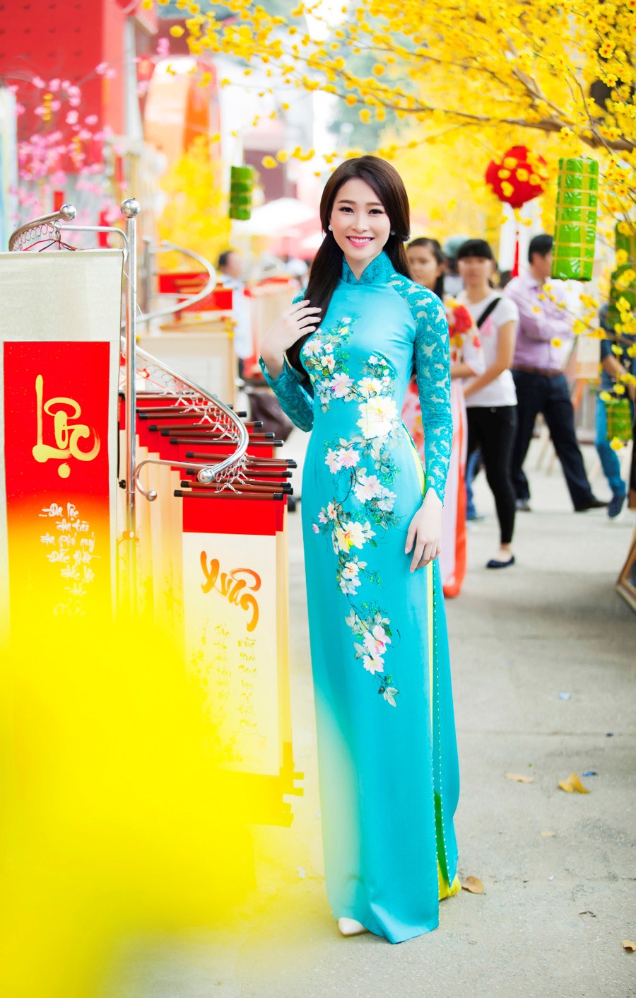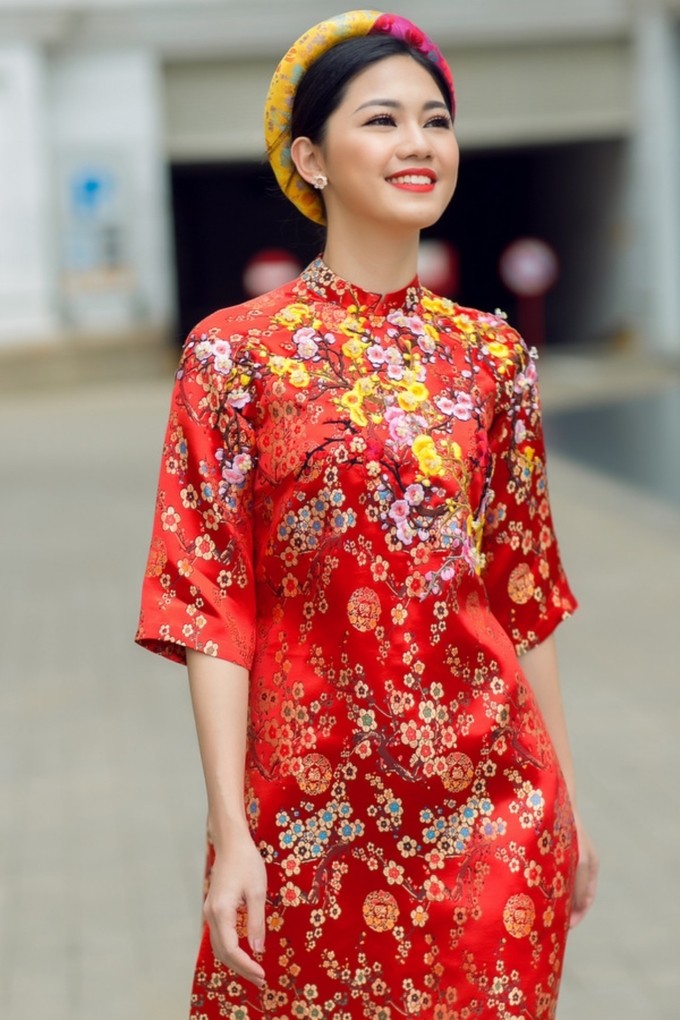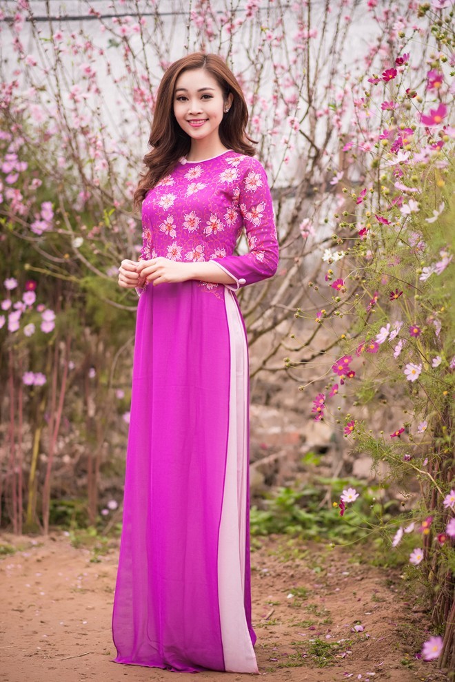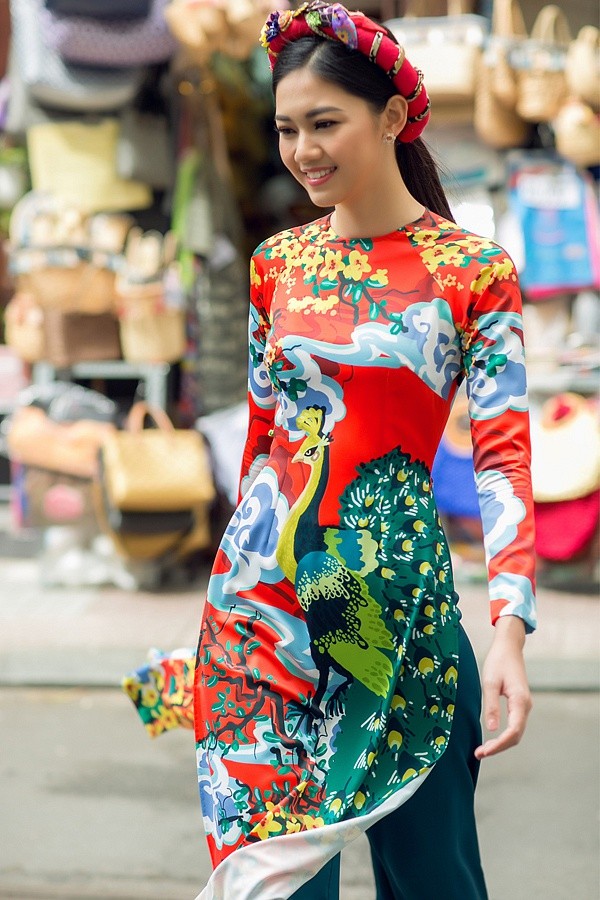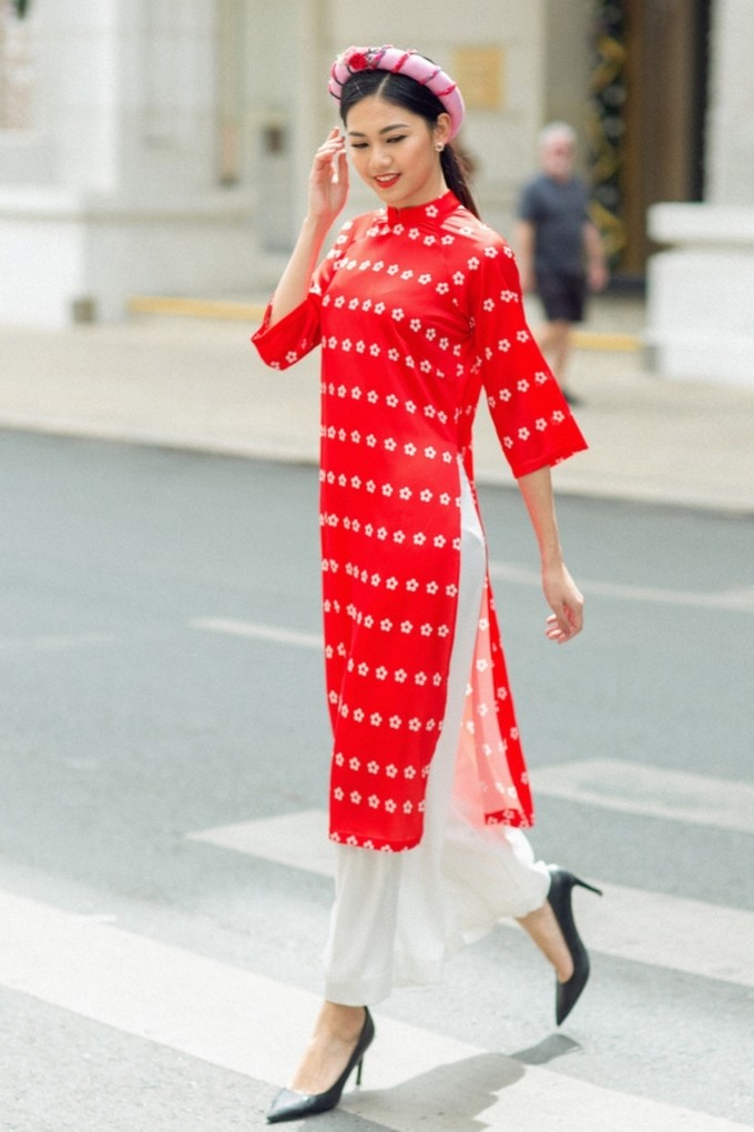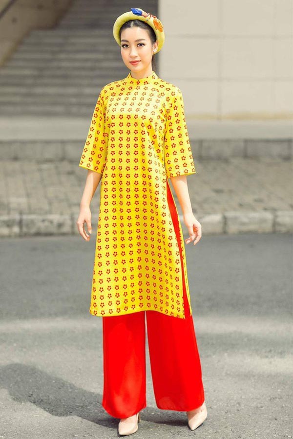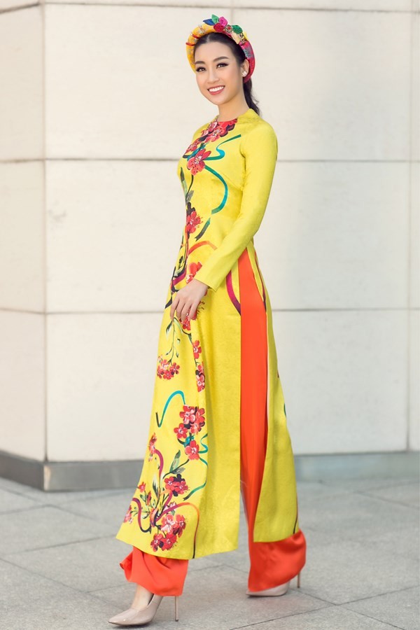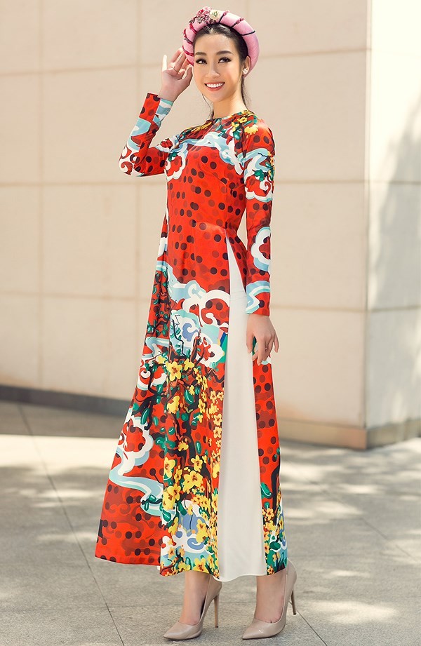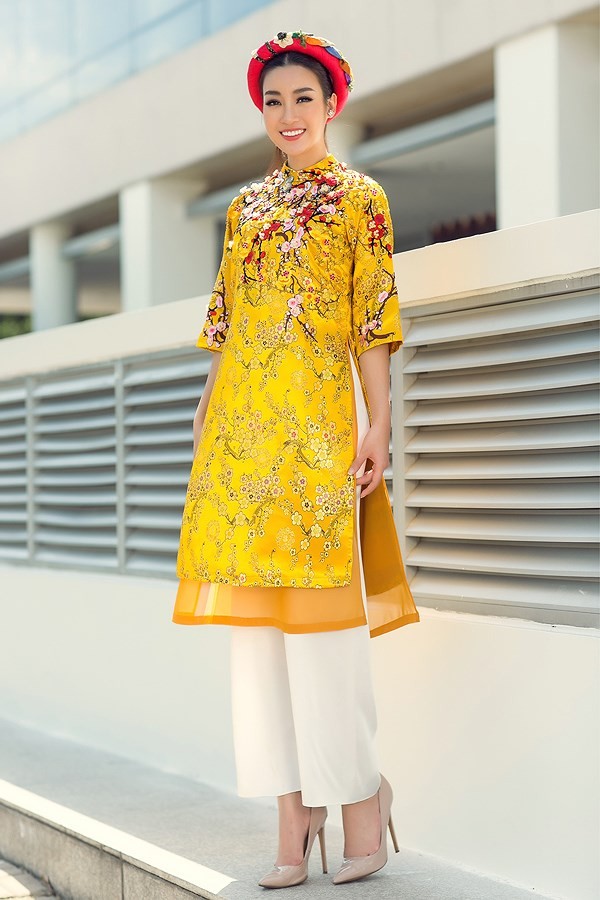 Hoa hậu Việt Nam 2016 Đỗ Mỹ Linh liên tục chọn cho mình những chiếc áo dài họa tiết hoa lá rực rỡ trong những lần xuống phố ngày cận Tết.