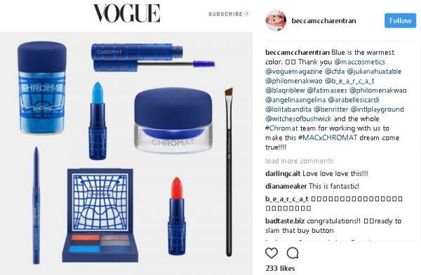 Mùa này, MAC lại một lần nữa gây tò mò cho nhiều tín đồ khi ra mắt BST toàn màu xanh biển đầy mê hoặc. Nhưng không phải đơn thân lẻ bóng mà là một sự kết hợp của MAC với CFDA - quỹ thời trang của Vouge, ấp ủ kế hoạch cho ra mắt dòng sản phẩm nổi bật và có sự xuất hiện của gam màu xanh. Sau một thời gian nghiên cứu điều chỉnh công thức, cuối cùng cũng đã hé lộ người chiến thắng và đảm nhận vai trò chính cùng MAC. Chính là Chromat của Becca McCharen-Tran, cô nàng thiết kế đứng đằng sau những tấm ảnh hậu kỳ của tạp chí Vouge.